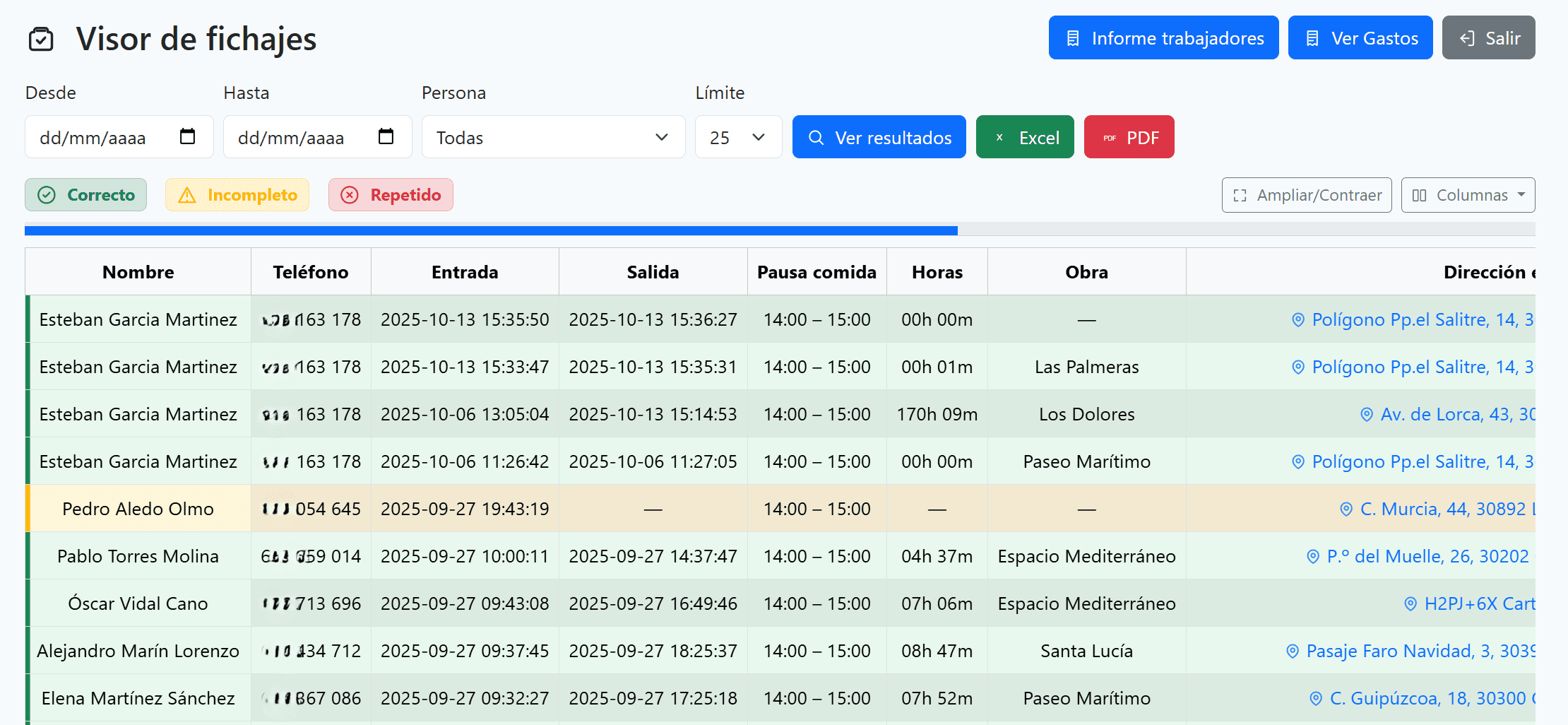 Podrás consultar fichajes en tiempo real, visualizar las ubicaciones en mapas y descargar informes en Excel o PDF con un solo clic.